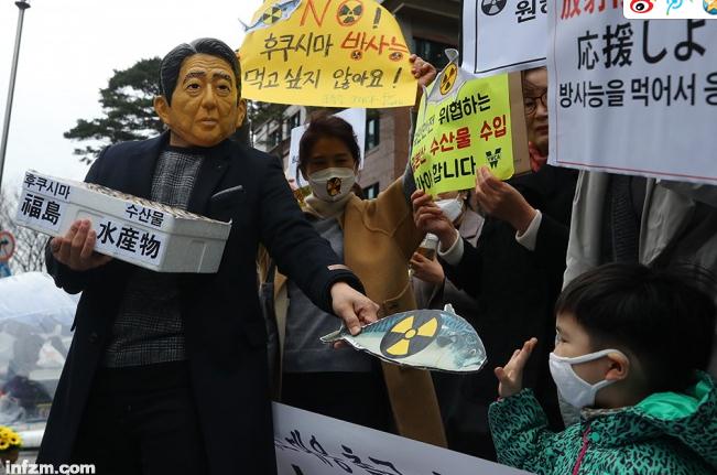 當地時間2018年3月19日,韓國首爾,民眾在日本大使館前示威,抗議進口福島水產品。(視覺中國/圖)