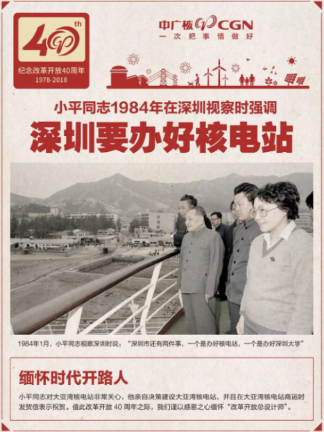 一句叮囑,將大亞灣核電站定位于深圳經(jīng)濟(jì)特區(qū)能否辦成功的衡量標(biāo)志之一;一份約定,道出了改革開放總設(shè)計師對大亞灣核電站建設(shè)成為“對外開放典范”的厚望;一個決策,力挽狂瀾,支撐著大亞灣核電站度過狂風(fēng)暴雨,繼續(xù)揚(yáng)帆前行;一聲祝賀,給披荊斬棘的大亞灣人巨大的鼓舞,讓他們奮勇前進(jìn)。可以說,正是有了“改革開放總設(shè)計師”鄧小平的指引和堅(jiān)定支持,才有了大亞灣核電站及我國商業(yè)核電的“高起點(diǎn)起步”,也才奠定了我國核電事業(yè)全面崛起的堅(jiān)實(shí)基礎(chǔ)。
