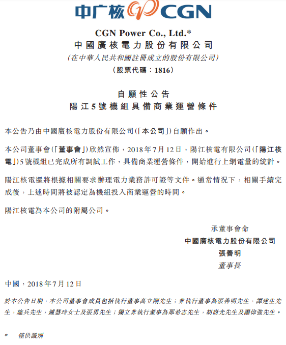 中廣核電力公告,2018年7月12日,公司的附屬公司陽江核電有限公司5號機組已完成所有調試工作,具備商業運營條件,開始進行上網電量的統計。陽江核電還將根據相關要求辦理電力業務許可證等文件。通常情況下,相關手續完成后,上述
