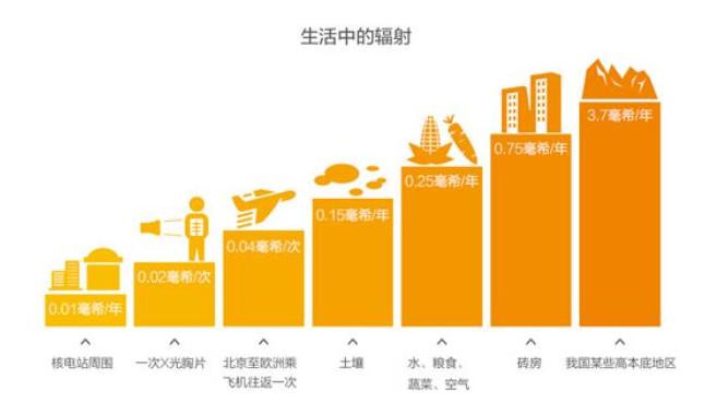 全世界平均來看,每人受到的天然輻射劑量大概為2.4毫希弗(“希弗”是輻射劑量單位)。此外,人們還會受到一定量的人工輻射,其中大部分來自醫療輻射。比如我們去醫院拍攝一次X光片大概會受到0.02毫希弗,每天吸一包香煙一年將會受到約1毫希弗。