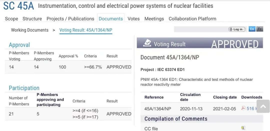 2021年2月,據IEC (國際電工委員會)官網顯示,由中國核動力研究設計院牽頭并聯合中核戰略研究總院申報的IEC標準《反應性儀的特性及測試方法》通過立項投票成功立項,項目編號為IEC 63374。該標準是核動力院首項核測量儀表領域國際標準。