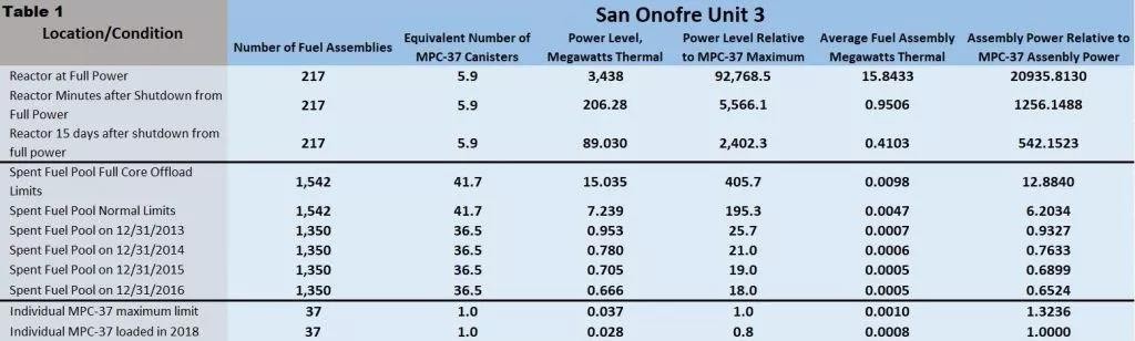 燃料組件的平均能量水平低于MPC-37罐中允許的最大能量水平。但相關庫存清單顯示了乏燃料池的風險為何高于干式儲存。乏燃料池中更高的能量水平再次轉化為在冷卻失效或受損時更少的反應時間。如果干預失敗,大量的燃料組件會釋放出更大的放射性云,而干式儲存的核燃料代表了最低能量水平下的最低燃料量。