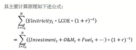 平準(zhǔn)化電價(jià)(LCOE)是假定在電廠項(xiàng)目計(jì)算期內(nèi),以此成本(即價(jià)格)出售電能的收入貼現(xiàn)總額,剛好等于電廠計(jì)算壽期內(nèi)的支出費(fèi)用貼現(xiàn)總額,是一種不考慮未來(lái)收益流的方法,反映了在假定財(cái)務(wù)期限和工作周期內(nèi)建造運(yùn)營(yíng)一座發(fā)電廠每兆瓦時(shí)的真實(shí)成本,該電價(jià)考慮了資金的時(shí)間價(jià)值(折現(xiàn)率r)。LCOE反映了全口徑成本,通常用于比較和評(píng)價(jià)不同種類電源競(jìng)爭(zhēng)力。