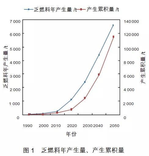 隨著核電機組的陸續建成和投運,乏燃料產生和累積量逐年上升(圖 1)。在不考慮秦山三期重水堆、山東石島灣高溫氣冷堆產生的乏燃料的前提下,在運、在 建機組按照實際計劃計算乏燃料,還未開工的機組按每100萬千瓦年產生乏燃料21t計算,新建機組按照 AP1000每年產生乏燃料26.5t計算,對乏燃料年產生量、產生積累量進行測算。從圖1可看到,到2020 年,乏燃料年產生量、產生累積量分別達1100t、7 800t;到2035年,乏燃料年產生量、產生累積量分別達2000t、34600t;到2050年,乏燃料年產生量、產生累積量分別達6600t、110000t。