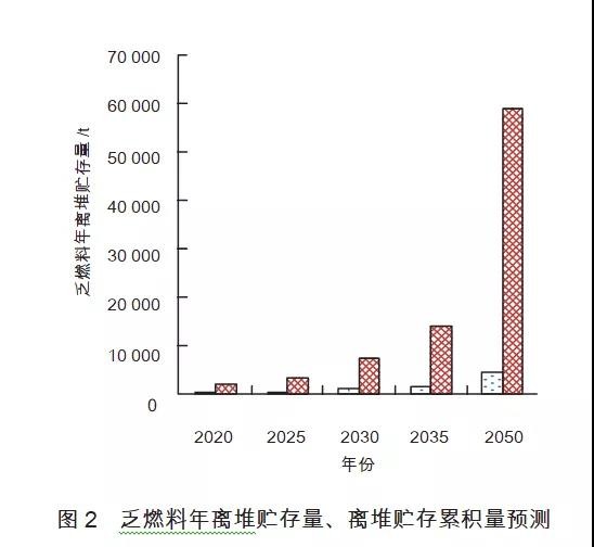 假設在運的后處理中試廠及配套水池正常運行,在建的田灣、大亞灣、秦山核電站的干法貯存設施,后處理示范廠、800t/a后處理廠的配套水池均按計劃建成投運,后處理示范廠、800t/a后處理廠均比規劃的時間節點推遲5年建成投運,結合乏燃料在堆冷卻滿10年后離堆貯存測算條件下的乏燃料離堆貯存累積量,對乏燃料離堆貯存實際需求進行預測。