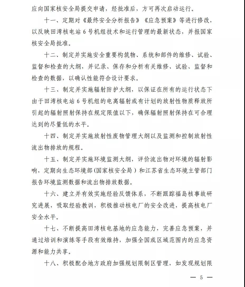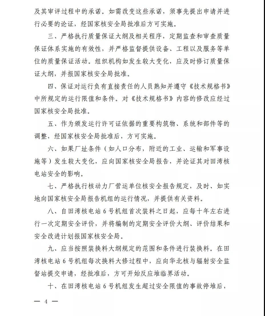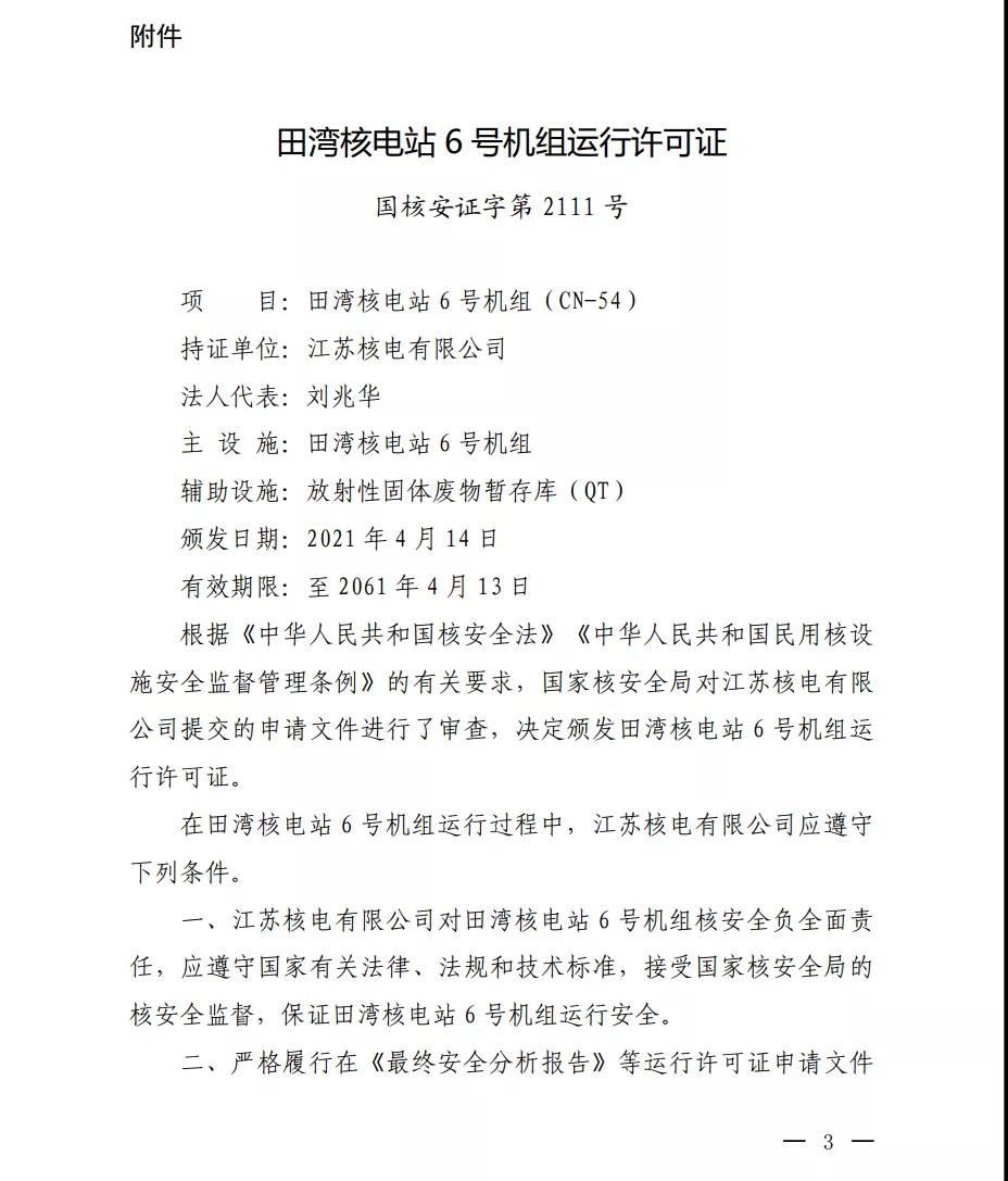 根據(jù)《中華人民共和國核安全法》《中華人民共和國民用核設(shè)施安全監(jiān)督管理條例》的有關(guān)要求,我局對你公司提交的田灣核電站6號機(jī)組運(yùn)行許可證申請書及相關(guān)文件進(jìn)行了審查,認(rèn)為該申請是可以接受的,決定頒發(fā)田灣核電站6號機(jī)組運(yùn)行許可證。