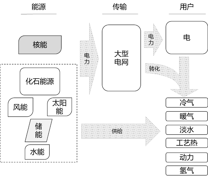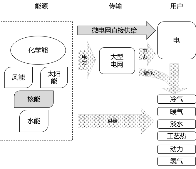 傳統化石能源為基礎的能源系統以電網為中心,間接將能源傳輸和轉化到用戶;為更好保障能源安全,提升多元能源需求的供給能力,降低能源傳輸的損耗,需要構建包含下一代核能在內的多元共生的能源系統構架和分配體系,該體系中核能與其他低碳能源共生,提供直接面向用戶的能源。