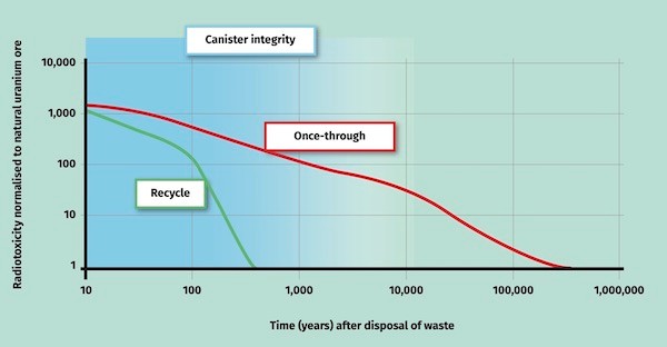 乏核燃料需要分為兩部分:主要是裂變產物;以及鈾、钚和次錒系元素的混合物。目標是分離裂變產物,使包裝件的危害衰減遵循圖 3 中的綠色曲線(而不是乏燃料本身的紅色曲線)。在開發所需類型的分離器方面已經取得了很大進展。