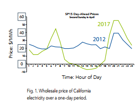 在加州等地,在太陽能和風能產量高的時候,上網電價會快速下跌,而在其他時候則會上漲。圖1顯示了加州2012年和2017年春季一天的電價。2012年的價格是由化石燃料發電廠制定的。2017年電價則受到了太陽能發電的影響,太陽能發電獲得了大量補貼。今天,燃氣輪機提供可調度的電力,以滿足調峰需求。