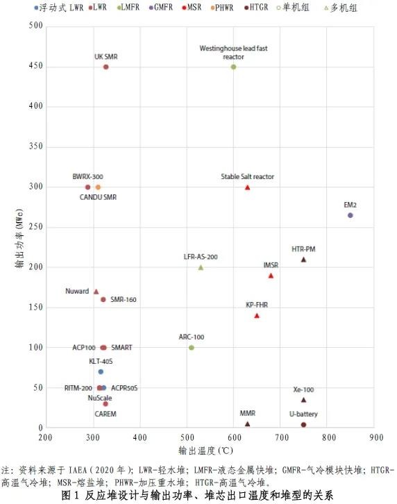 當今的SMR之所以受到關注,不僅因為其尺寸小,更是由于小尺寸帶來的安全性、交付模型和商業(yè)案例等。商業(yè)化進程最快的小堆設計均基于已經積累數(shù)十年運行和監(jiān)管經驗的大型輕水堆設計。有一些設計正在建造中(如阿根廷的CAREM、中國的ACPR50S)或正在商業(yè)運行中(如俄羅斯的KLT-40S)。這些技術是世界范圍內運行的二代和三代/三代加反應堆的小型進化變體,受益于其數(shù)十年的運行和監(jiān)管經驗。圖1是某些反應堆設計與輸出功率、堆芯出口溫度和堆型的關系。最成熟的第四代設計是金屬冷卻和氣體冷卻系統(tǒng),采用這些設計的一些機組目前正在運行或建造中。