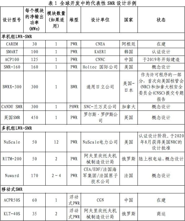 目前,至少有72個SMR概念正處于不同的開發(fā)階段(IAEA,2020年),較2018年增加了40%(IAEA,2018年)。表1列舉了國際上處于開發(fā)階段的代表性SMR,其中大約一半的設計概念基于LWR技術,另一半基于第四代概念。雖然“SMR”一詞在世界各地被用來指所有小型反應堆設計,但主要類型的SMR之間仍存在顯著差異,特別是在設計模塊化程度方面。