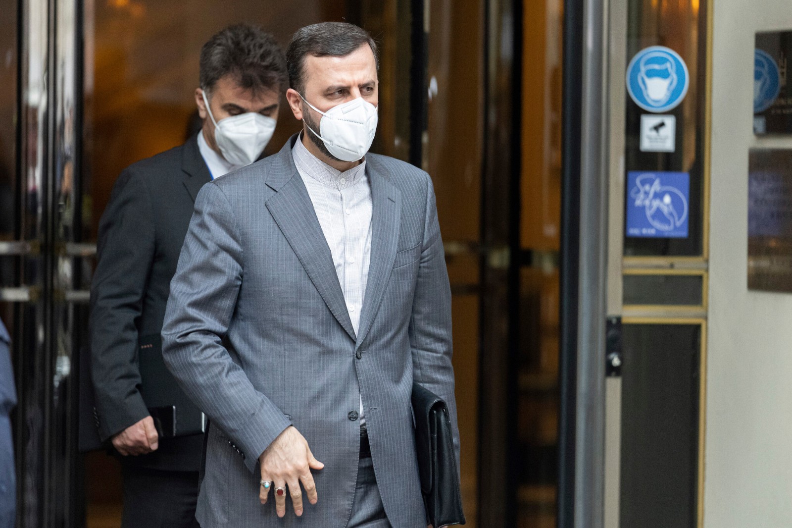2021 年 6 月 12 日,伊朗國際原子能機構 (IAEA) 州長 Kazem Gharib Abadi 離開維也納大酒店,在那里舉行了閉門核談判。 (美聯社照片 / Florian Schroetter)