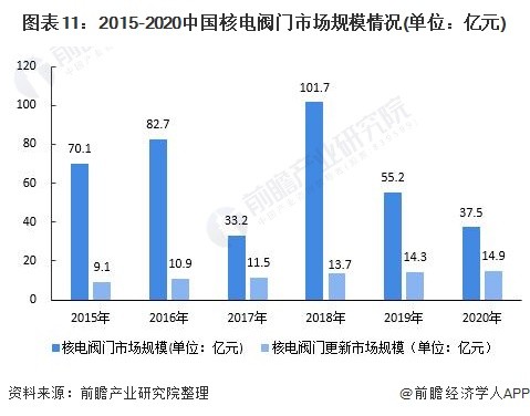 閥門設備則一般在運行3年后出現備件更換等,考慮到時間滯后性和每年關停的核電機組數量,假設每年可運行核電機組中有90%需要維修,按照每臺百萬千萬級核電機組的閥門維修、更換費用每年約3375萬元,結合中國核電機組可運行數量測算,2020年,中國核電閥門更新市場規模為14.9億元。核電閥門總市場規模為37.5億元。