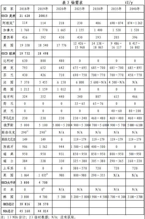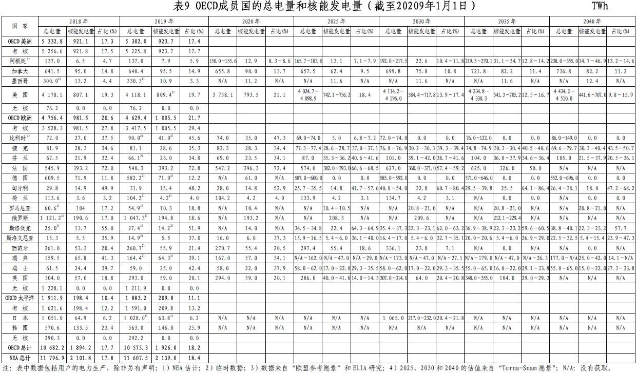 2021年3月,經合組織/核能機構(OECD/NEA)發布了2020版《核能數據》。《核能數據》概述了至2040年核能發電情況及核燃料循環方面的要求和能力,同時包含了一些成員國的報告,這些報告更新了該國核能規劃中的核能狀況、發展趨勢以及問題。《核能數據》提供的數據涉及了OECD和NEA國家的核能發電、核電反應堆發展、鈾資源及其生產、轉化、濃縮、乏燃料貯存與后處理等方面。