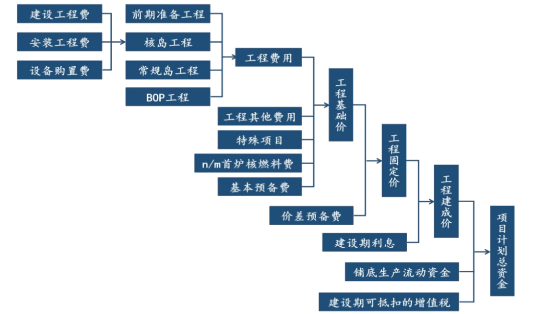 在基礎價的基礎上考慮逐年物價浮動的建設造價總金額,即為工程固定價。在工程固定價的基礎上計入建設期利息、可抵扣增值稅等金額后,即為核電項目的總計劃投資。