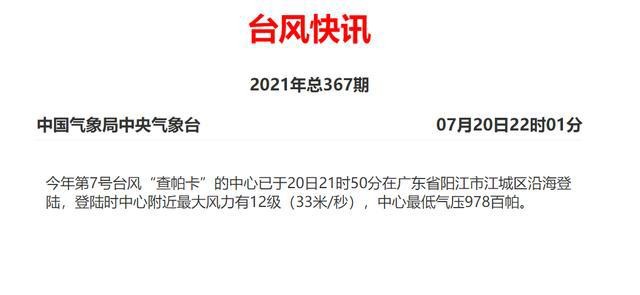 據中央氣象臺發布的消息,今年第7號臺風 “查帕卡”已于7月20日21點50分在廣東省陽江市江城區沿海登陸,登陸時中心附近最大風力12級