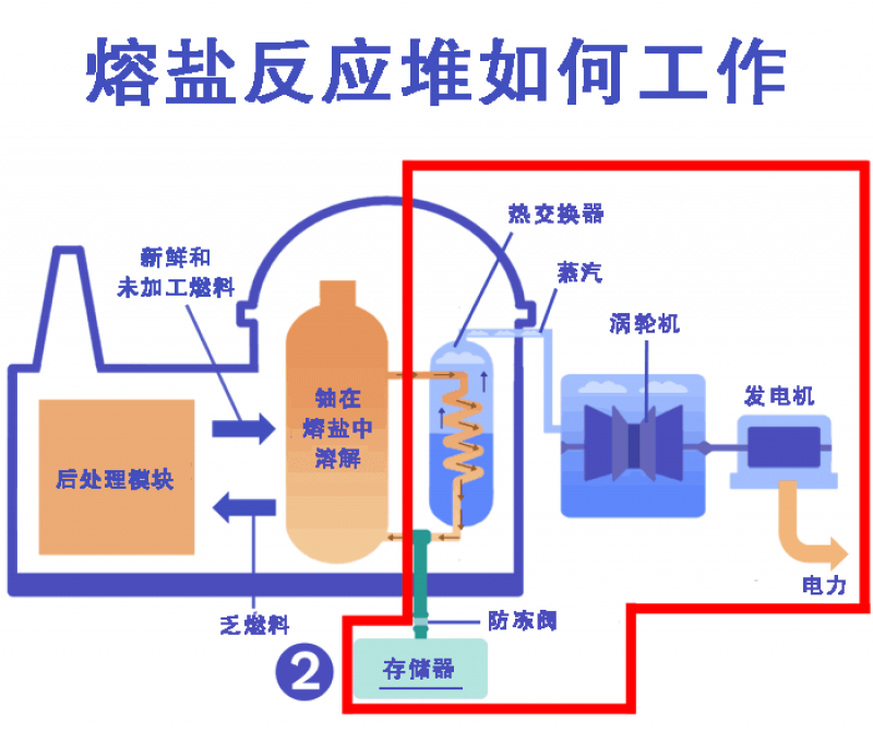 熔鹽堆是一種沒有慢化劑劑的快堆。錒系元素(如钚、镅和鋦)不可避免地在熱譜反應(yīng)器中積累,而熔鹽堆能夠使這些元素發(fā)生反應(yīng)。在核物理學(xué)家看來,這種設(shè)計很不尋常。