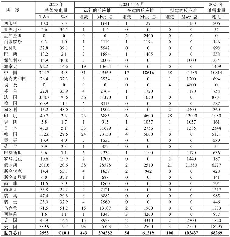 表中“%e”表示核能發電占發電總量的百分率。全球核能發電占全球發電總量的10.1%,其中法國高達70.6%。本數據是世界核能協會WNA 2021年1月份提供的數據。