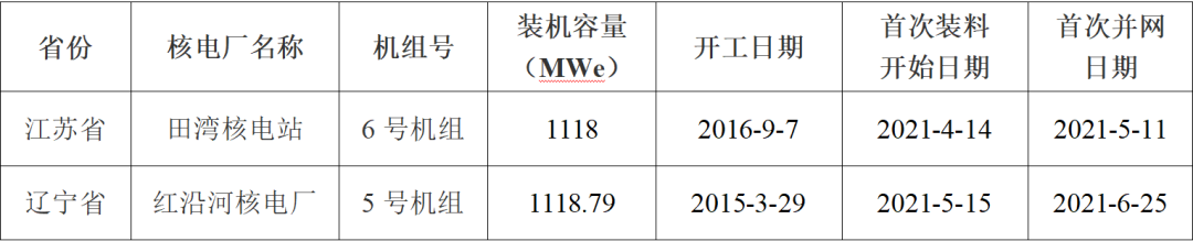 ▼表1 2021年1-6月首次裝料的核電機(jī)組信息