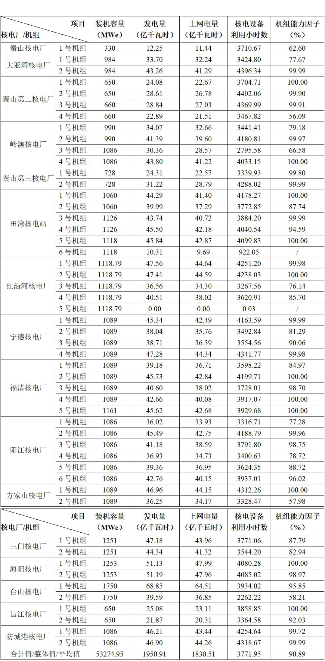 2) 本表最后一行 “合計(jì)值/整體值/平均值”中,裝機(jī)容量、發(fā)電量、上網(wǎng)電量為各機(jī)組合計(jì)值,核電設(shè)備利用小時(shí)數(shù)為全部機(jī)組整體值,能力因子為全部機(jī)組的算數(shù)平均值。