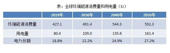 從下表中可以看出,從2019年到2050年全球用電量雖然逐年上升,但在終端能源消費總量中最高為27.2%,其它均為非電力消費。