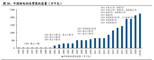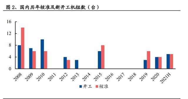核電進入積極有序發(fā)展新階段,2021H 新開工 5 臺機組。2019 年,核電審批重啟 獲得官方確認。到 2025 年中國在運核電裝機達到 7000 萬千瓦, 在建核電裝機達到 3000 萬千瓦;到 2035 年在運和在建核電裝機容量合計將達到 2 億千瓦;核電建設(shè)有望按照每年 6 至 8 臺機組穩(wěn)步推進。2021 年上半年,我國 已新開工 5 臺機組(包括昌江核電站 3 號機組,田灣核電站 7、8 號機組,徐大堡 核電站 3、4 號機組),積極有序發(fā)展的政策正在逐步兌現(xiàn)。