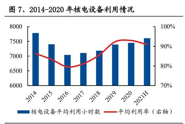 核電發(fā)電量 2021H 增速明顯回升,利用小時數(shù)延續(xù)提升趨勢。2020 年核電發(fā)電 量 3662.43 億千瓦時,同比增長 5.02%,增速放緩;2020 年核電平均利用小時數(shù) 達 7453 小時,同比繼續(xù)提升。2021 年上半年,核電發(fā)電量 1950.90 億千瓦時,同 比增長 13.70%,增速明顯回升;同時設(shè)備利用小時數(shù)達到 3805 小時(年化后為7610 小時),設(shè)備利用小時數(shù)自 2016 年以來持續(xù)提升。