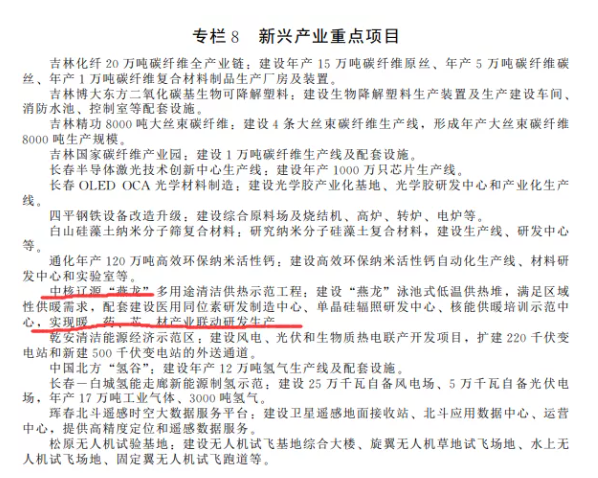 2021年4月1日,《吉林省國民經濟和社會發展第十四個五年規劃和2035年遠景目標綱要》(簡稱《吉林省“十四五”規劃》)下發,提出穩妥實施核能供熱示范工程。