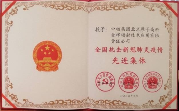 2020年9月8日,全國(guó)抗擊新冠肺炎疫情表彰大會(huì)在人民大會(huì)堂召開,金輝輻射公司被黨中央、國(guó)務(wù)院、中央軍委授予“全國(guó)抗擊新冠肺炎疫情先進(jìn)集體”。