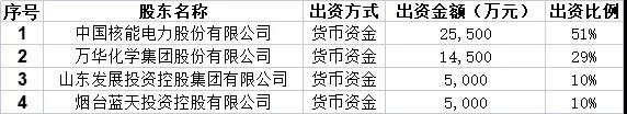 中國核電擬與萬華化學、山東發展和煙臺藍天控股共同出資設立山東核能,其中公司擬出資25,500萬元,持有山東核能51%股權。股權結構: