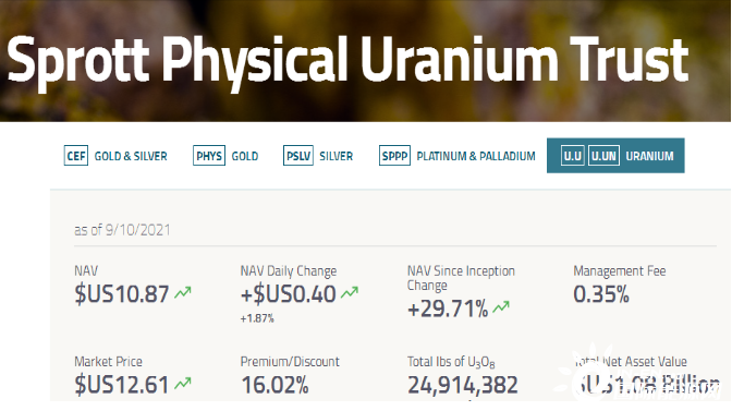 國際鈾市場交易存在期現(xiàn)兩級體系,其中絕大部分屬于電廠長期合約采購。如今基金正在塑造鈾現(xiàn)貨市場,并造成前所未有的需求水平。今年7月,Sprott Asset Management設(shè)立的實物鈾信托基金(Sprott Physical Uranium Trust)吸引了不少希望參與新一輪牛市的資金。該基金自成立以來便在市場上瘋狂購入實物鈾,截至10日共購買了2491萬磅鈾濃縮物,即八氧化三鈾(U3O8),是2020年末總現(xiàn)貨量的1/4,凈資產(chǎn)價值突破10億美元。