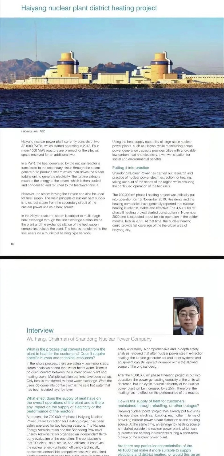 “海陽核能供熱”案例是全球在“利用核能實現(xiàn)碳減排”方面的良好實踐,簡述了海陽核電項目情況,詳細(xì)介紹了海陽核能供熱原理,海陽核能供熱一期70萬㎡及二期450萬㎡項目情況及目前取得的效果等內(nèi)容。報告提出,“海陽核電廠為城市提供可負(fù)擔(dān)的低碳電力和熱力,實現(xiàn)了社會效益和環(huán)境效益的雙贏”。