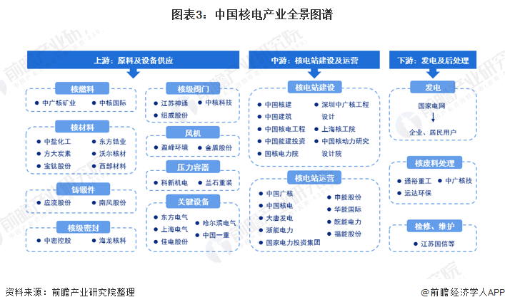 核電是我國能源供應體系的重要分支,也是新能源的重要組成部分。核電產業的上游包括核電設備、核燃料核材料的供應等;中游包括核電站的建設、運營;下游主要涉及發電、維修和后處理市場。