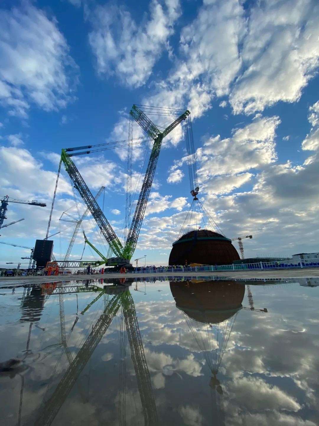 當天凌晨6點多,吊裝工作正式開始。隨著吊裝總指揮一聲令下,3200噸級的起重機將穹頂緩緩吊離地面,經過變幅、升鉤、吊車行走、大臂逆時針回轉等一系列流暢的動作,直達反應堆廠房上方,隨后緩慢下降,經調整無誤后,平穩落鉤就位在安全殼鋼襯里上。