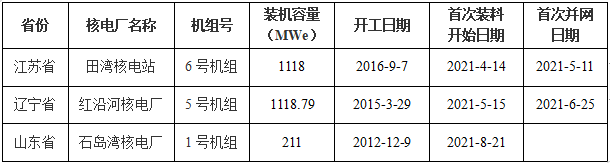 截至2021年9月30日,我國運行[1]核電機組共52臺(不含臺灣地區),裝機容量為53485.95MWe(額定裝機容量)。2021年1-9月全國共有3臺核電機組首次裝料,詳見表1。