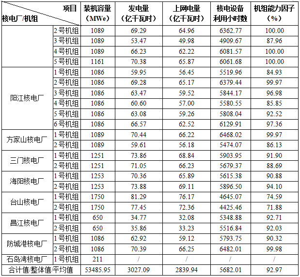 2) 本表最后一行“合計值/整體值/平均值”中,裝機容量、發電量、上網電量為各機組合計值,核電設備利用小時數為全部機組整體值,能力因子為全部機組的算數平均值。