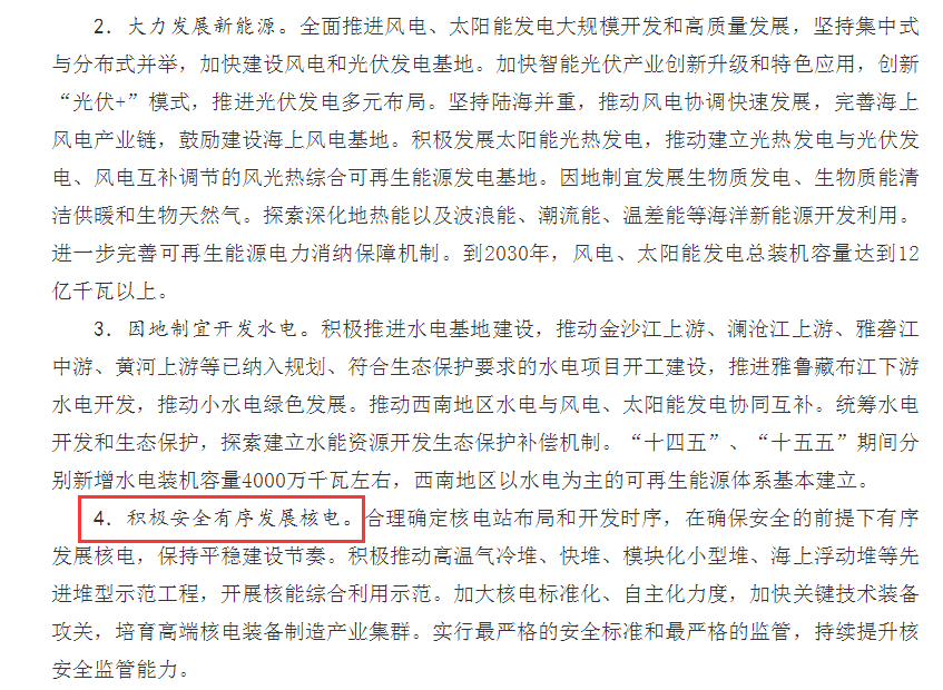 10月26日,國務(wù)院印發(fā)《2030年前碳達(dá)峰行動(dòng)方案》,圍繞推進(jìn)碳達(dá)峰、碳中和作出了統(tǒng)籌安排和系統(tǒng)部署,“積極有序安全發(fā)展核電”第4次寫入國家最高行動(dòng)綱領(lǐng),凸顯核電在推進(jìn)能源低碳轉(zhuǎn)型,服務(wù)“雙碳”戰(zhàn)略中的重要作用。