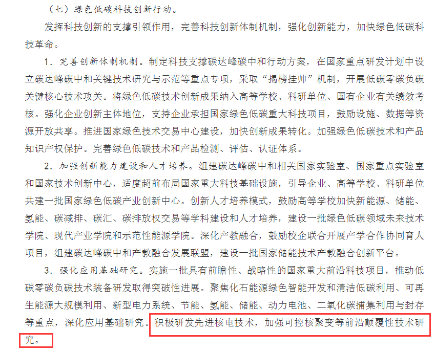 全文13731字的《碳達(dá)峰行動(dòng)方案》6次提及核電關(guān)鍵字,并將核電單列為一節(jié)加以重點(diǎn)描摹,細(xì)化了“積極有序安全發(fā)展核電”的相關(guān)工作任務(wù),并提出積極研發(fā)先進(jìn)核電技術(shù),加強(qiáng)可控核聚變等前沿顛覆性技術(shù)研究。