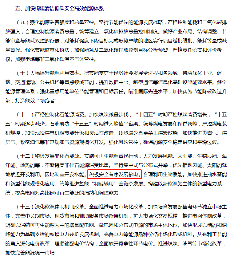 在寫入中央“雙碳”意見、國務(wù)院碳達(dá)峰行動(dòng)方案前,核電還先后寫入了2021年全國兩會(huì)政府工作報(bào)告和“十四五”規(guī)劃,且都使用了“積極有序發(fā)展”一詞,明確了國家發(fā)展核電產(chǎn)業(yè)傾向“積極主動(dòng)”的立場。