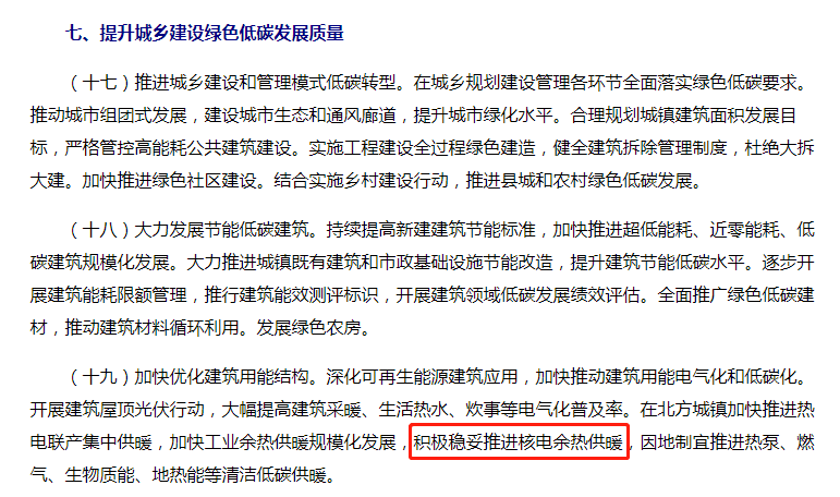 在此份雙碳意見中,關(guān)于核電的表述共計(jì)22個(gè)字,兩段措辭及其內(nèi)涵各有不同。第一處表述是“積極安全有序發(fā)展核電”,第二處表述是“積極穩(wěn)妥推進(jìn)核電余熱供暖”,兩段措辭均以“積極”二字開頭,闡明了國家積極有序發(fā)展核電、核能供暖的立場。