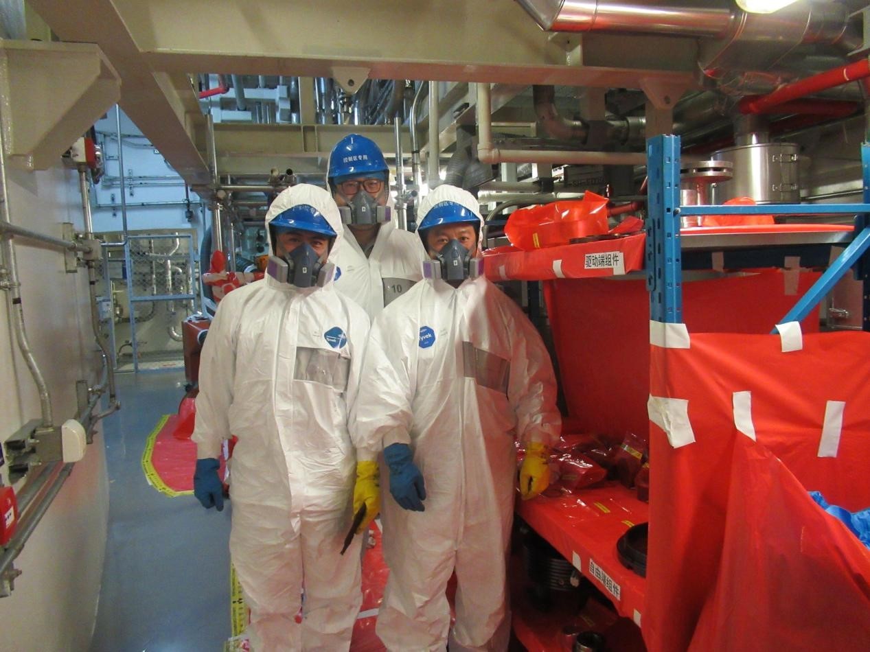 “兄弟辛苦了!趕快休息補水補充體力,下一組人員2.5小時后換班,大家加油!”說話間,VCS風機更換專項工作組又完成了一次換班。由于核島內環境溫度較高,工作組需要在高溫且高空的工況下工作,不一會汗水就浸透了防護服。為了保持良好的狀態和體力,工作人員分組每隔2.5個小時出控制區補水輪換作業。該項目涉及焊接、起重、腳手架、保溫、土建、防腐等多個專業、協調難度大、工期緊張,兩臺機組均為首次執行,中電華元也是首次開展該項工作。專項工作組采取24小時不間斷作業,實時關注現場進展,各專業工作負責人嚴格執行“321負接口”原則,積極協調配合專業,各個工序環環相扣,有序組織、運作順暢,保證了項目的順利開展。
