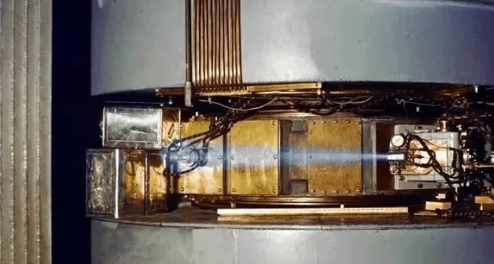 圖中的藍(lán)光是一束被加速的粒子流(可能是氫核或者是氘核)電離周圍空氣產(chǎn)生的