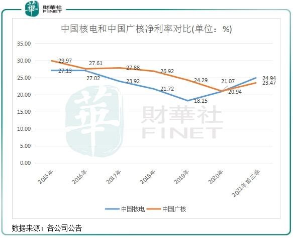 數(shù)據(jù)顯示,2015年-2020年,中國廣核的凈利率水平均高于中國核電。在今年前三季,受部分機(jī)組繳納乏燃料處置基金以及核電項(xiàng)目施工量增加影響,中國廣核報(bào)告期內(nèi)28%的營業(yè)成本增幅高于17%的營收增幅,導(dǎo)致其凈利率有所下滑,并被中國核電趕超。