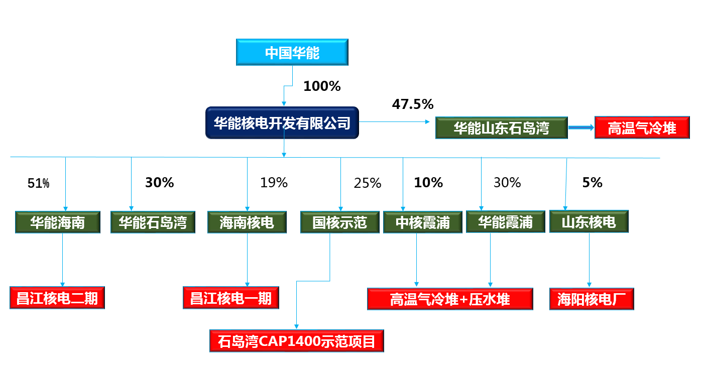 中國華能是繼國家電投之后第2家獲得核電資質的發電集團,為我國第4家擁有核電牌照的央企。中國華能集團旗下華能核電開發有限公司(簡稱“華能核電”)控有華能海南昌江核電有限公司51%股權,對昌江核電二期工程擁有控股權。同時,華能核電還控有華能山東石島灣核電有限公司(簡稱“華能山東石島灣”)47.5%股權,系石島灣高溫氣冷堆示范工程的控股方。