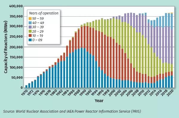 圖2顯示了自1970年以來任何一年運行的反應堆的年齡。(這些是任何一年內發(fā)電的反應堆的容量,不包括歸類為可操作但未發(fā)電的反應堆,例如過去10年日本的一些反應堆。) 20世紀70年代核建設的第一次浪潮,都反映在超過十年、二十年、三十年和四十年的反應堆的增長上。最近出現(xiàn)了第一批運行50多年的反應堆。