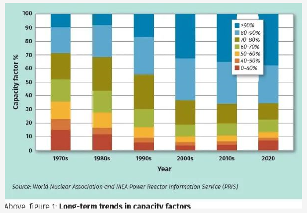因此,2020年出現(xiàn)的更高容量因數(shù),不僅是通過較新反應堆的良好性能實現(xiàn)的,而且是通過較舊反應堆的性能改進實現(xiàn)的。 反應堆的使用年限似乎不是實現(xiàn)高容量因數(shù)的障礙。
