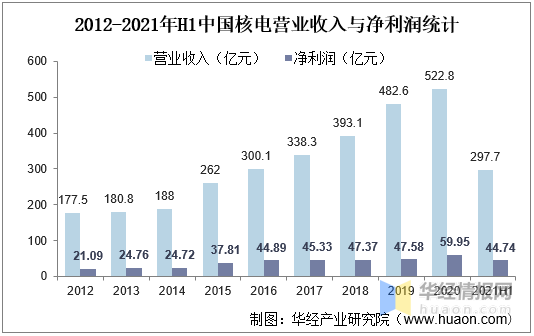 中國核能電力股份有限公司的業務范圍:核電項目及配套設施的開發、投資、建設、運營與管理;清潔能源項目的投資、開發;輸配電項目投資、投資管理;核電運行安全技術研究及相關技術服務與咨詢業務、售電。據統計,截至2021年上半年中國核電營業收入為297.7億元,同比增長24.64%,凈利潤為44.74億元,同比增長46.23%。