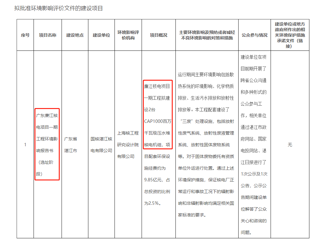 生態環境部發布關于2021年12月13日擬作出的建設項目環境影響評價文件審批意見的公示(核與輻射),其中廉江核電項目一期工程擬建設2臺CAP1000百萬千瓦級壓水堆核電機組。