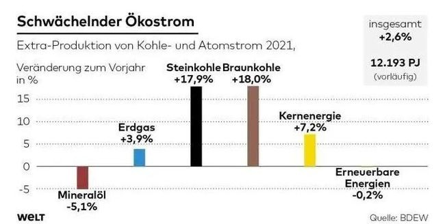2021年增加燃煤發(fā)電是必要的,因為今年風(fēng)力發(fā)電的產(chǎn)量非常低:陸地上的風(fēng)力發(fā)電量下降了12%,海上的風(fēng)力發(fā)電量下降了7%。為了填補空缺,就連核電站也不得不在關(guān)停前不久重新運轉(zhuǎn)起來:2021年核電產(chǎn)量增長了7%,但是目前現(xiàn)存的6座核電站中的3座要在年底關(guān)閉。總的來說,2021年,燃煤發(fā)電1620億千瓦時,風(fēng)電1170億千瓦時,非綠色能源滿足了德國58%的能源需求。而綠色電力的份額從46%下降到42%。如下圖是2021 年德國非綠色能源發(fā)電量變化情況: