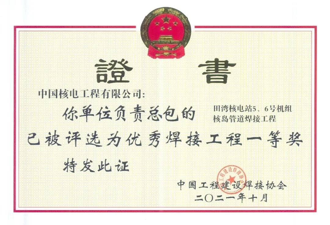自2018年以來,中核工程公司總承包的田灣核電二期擴建工程---田灣核電站3號機組核島安裝安全系統焊接工程榮獲2018年全國優秀焊接工程;總承包的田灣核電二期擴建工程---田灣核電站3號機組主管道焊接工程榮獲2019年全國焊接工程一等獎; 田灣核電站3號核島鋼結構工程榮獲2019年全國焊接工程優秀焊接工程一等獎;總承包的田灣核電二期擴建工程---田灣核電站4號機組主管道焊接工程榮獲2020年全國優秀焊接工程一等獎; 總承包的田灣核電站5、6號機組核島管道焊接工程榮獲2021年全國優秀焊接工程一等獎。